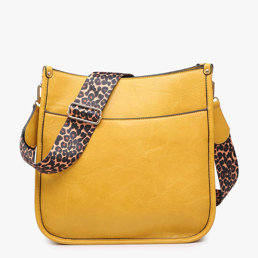 -Features: Top zipper closure, front snap open pocket, inner zip and slip pockets, back zipper pocket, adjustable guitar strap (as pictured), gold-tone hardware -Material: Vegan leather